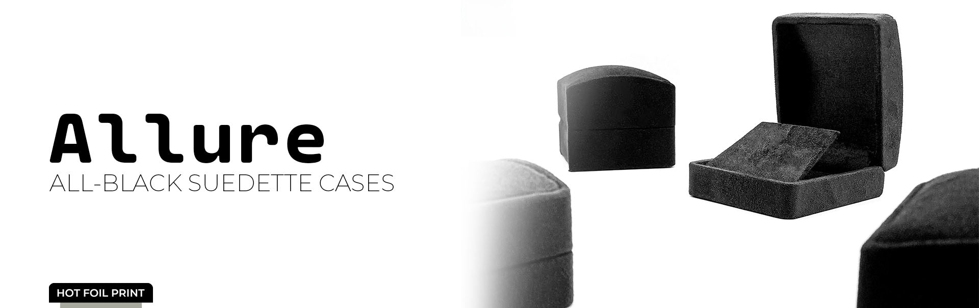 The Allure range of domed jewellery cases is covered in a soft, black suedette material and fitted with a black inner satin. The complete black design allows your pieces to shine without compromise.