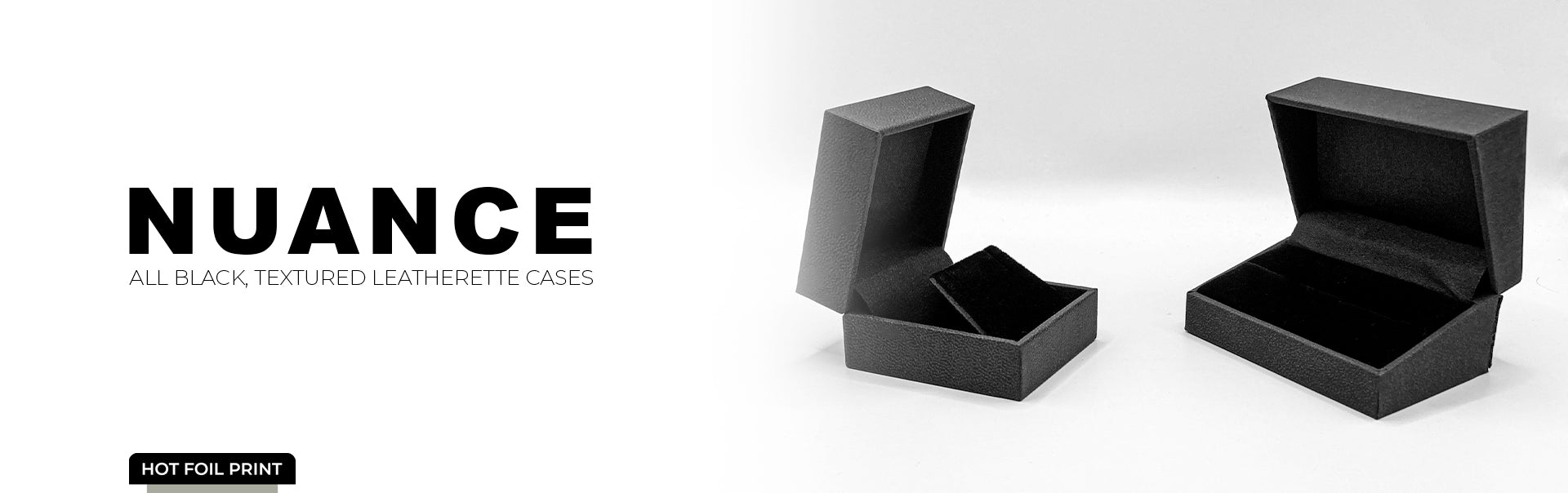 Allow your pieces to shine into the background with these deep black jewellery cases. The Nuance range (formally known as Lustre) is wrapped in a premium leatherette with a faint graining effect, giving these cases a luxurious feel.