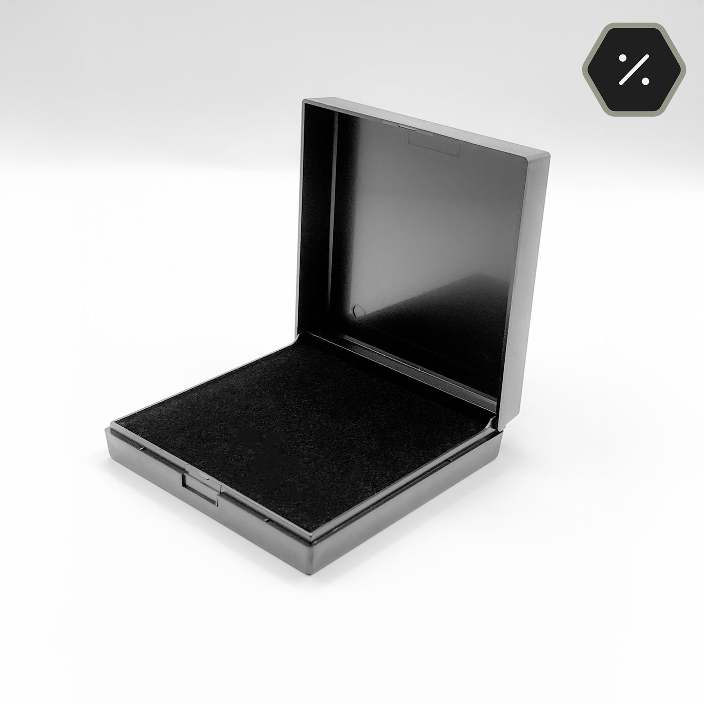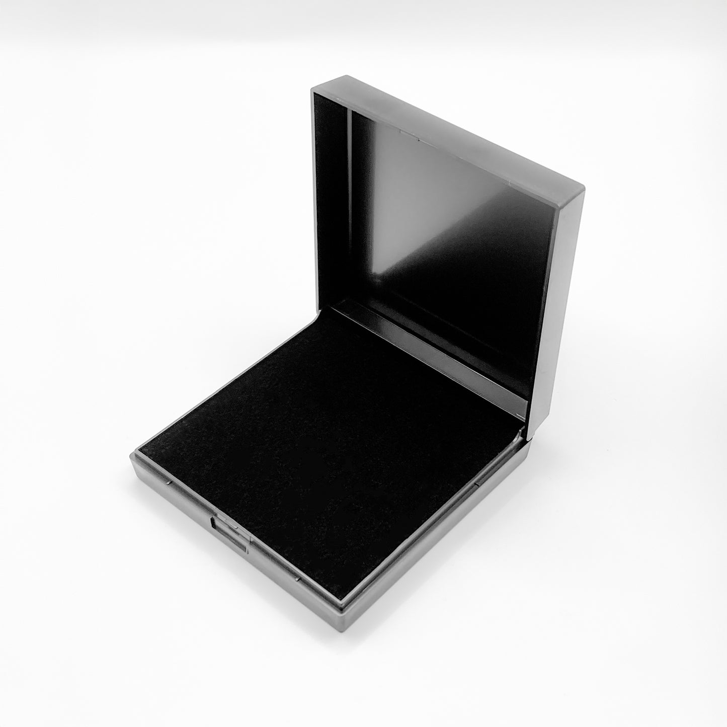 The Calais black plastic Bangle case comes fitted with a flock-covered black interior foam pad to cushion your piece. The snap-close hinged lid is secure and robust despite how thin the material is. A good, inexpensive option.