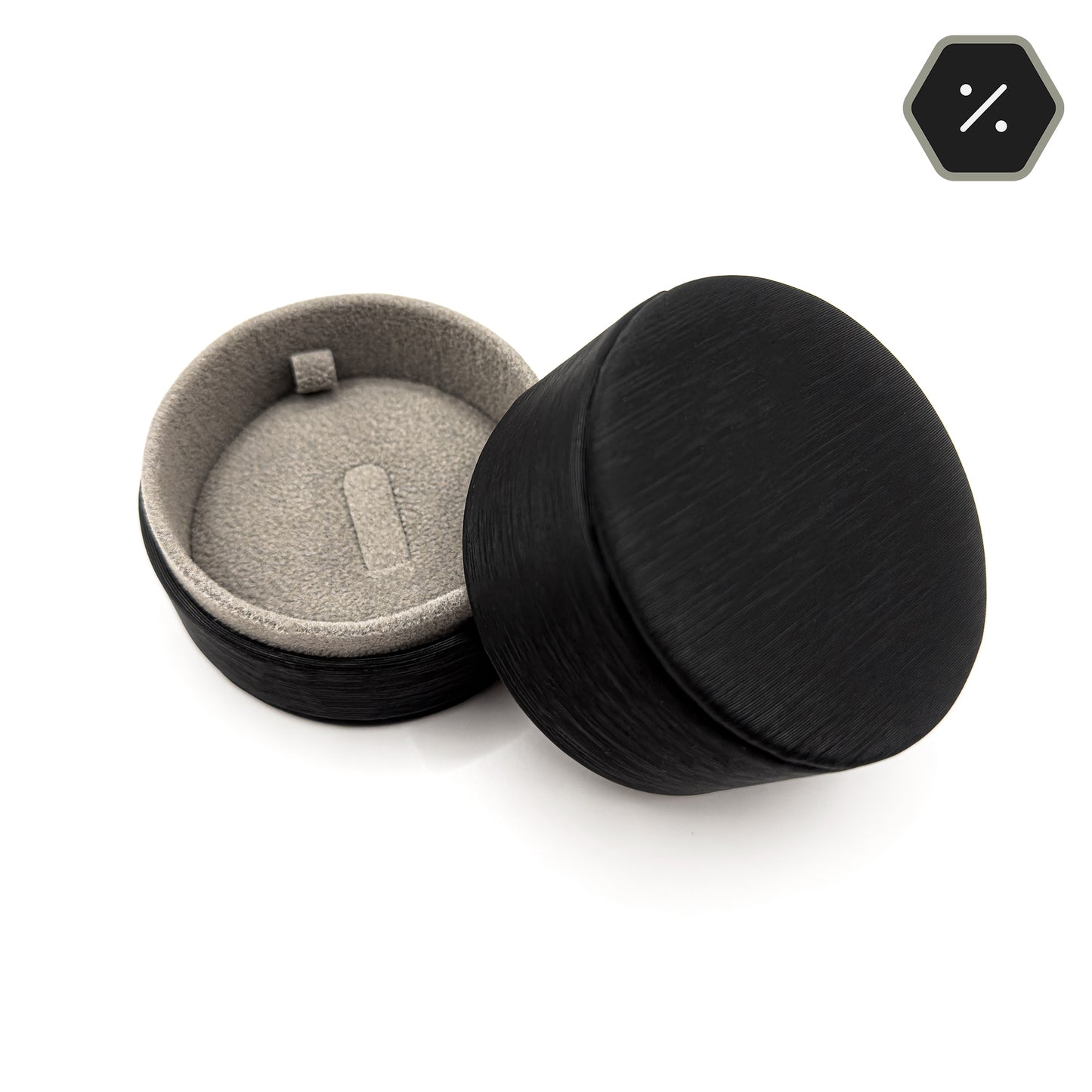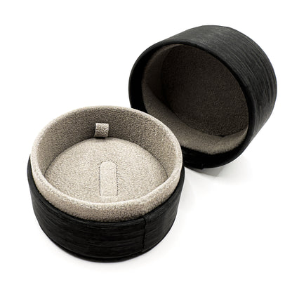 A quality, cylindrical Ring box that exudes luxury. Finished with an almost shiny, black faux suede material and cushioned lid, this box stacks beautifully and stands out against any backdrop. A beautiful addition to any window display.