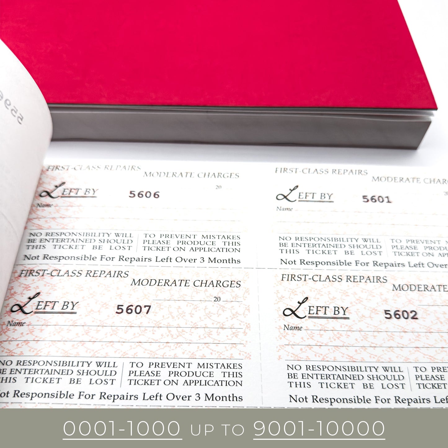 Each book contains 1000 self-duplicating tickets, with matching pages numbered from 0001–1000 all the way up to 9001–10000.