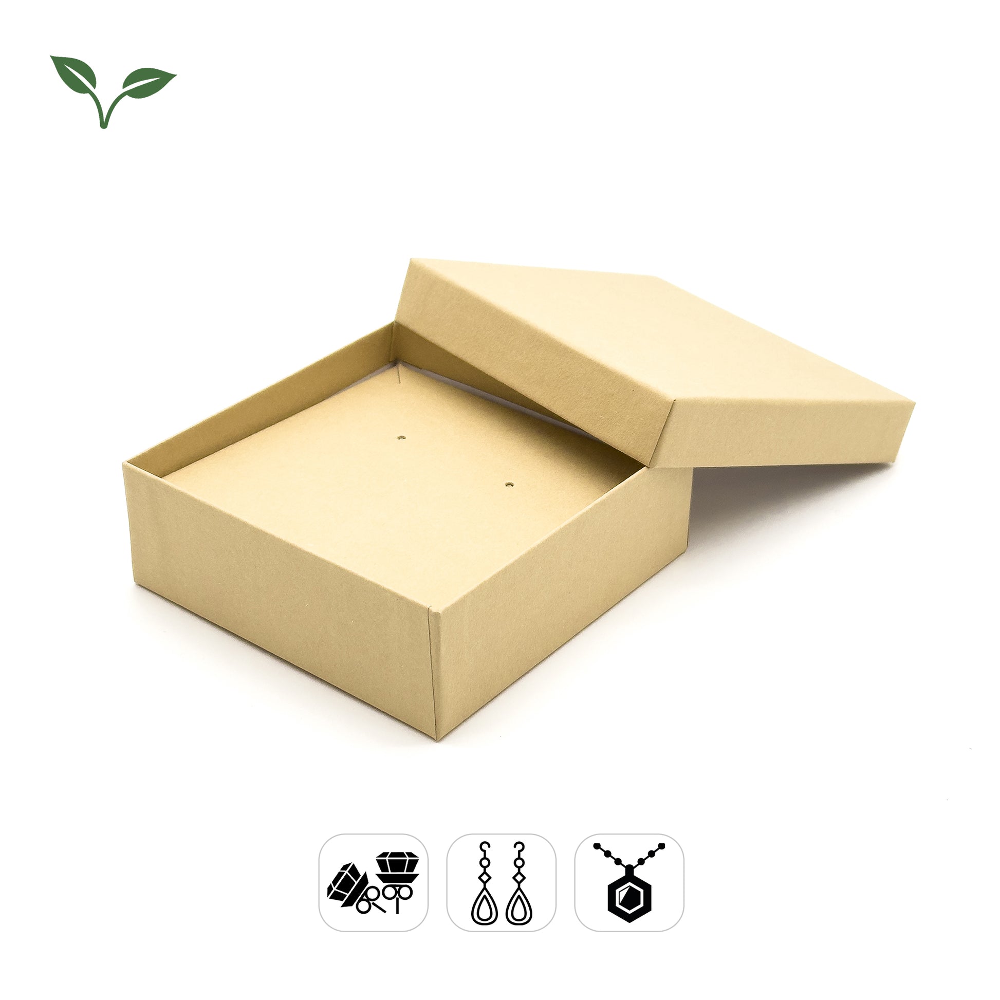 A fully recyclable Universal box for various pieces, such as a set of stud or drop earrings or even a light chain ... or even a decorative plate—you can fit many items in this box. Made from kraft paperboard, it has an elegant, yet modern and spacious simplicity about it. The perfect kraft option for the eco-conscious jeweller.
