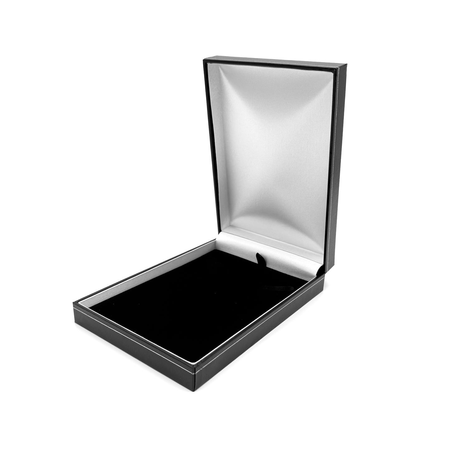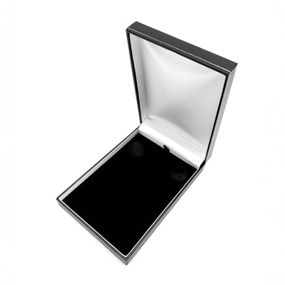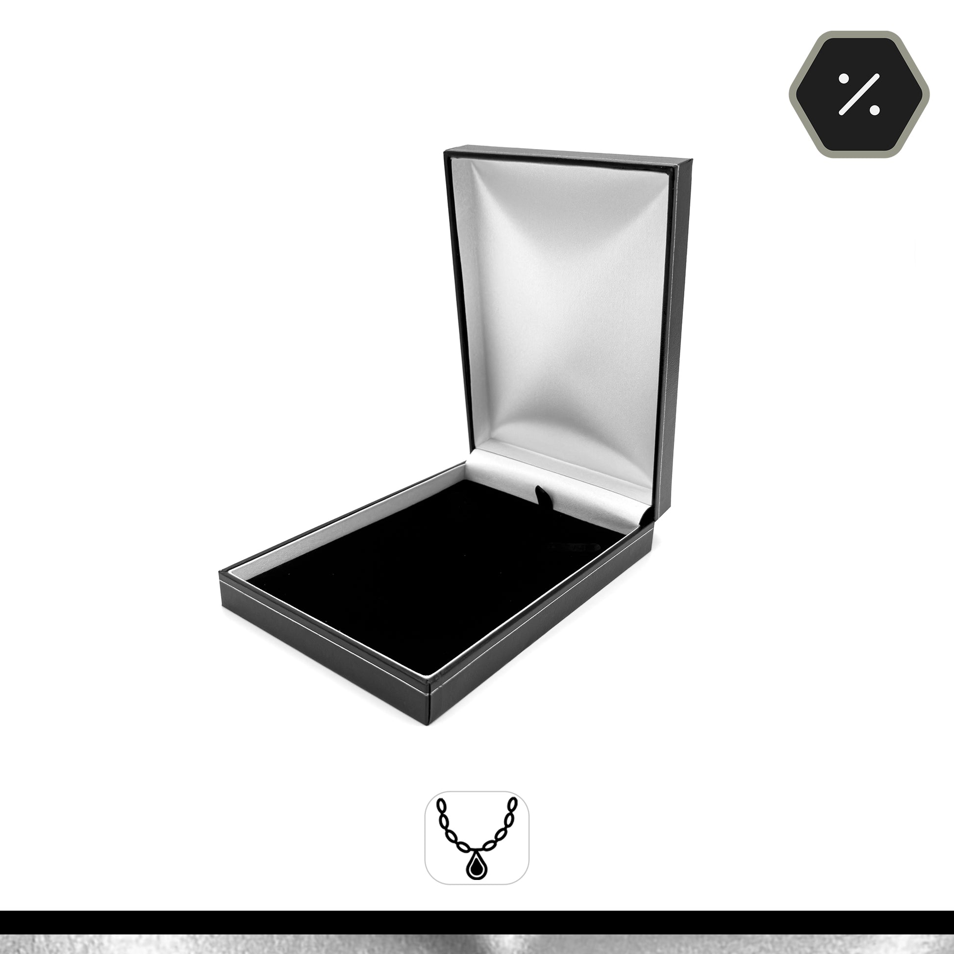This spacious Portrait Necklace case, wrapped in black leatherette paper with silver profiling to the outside lid, is a timeless classic. Its hinge closure is seamless and satisfying, and the overall quality is quite remarkable. Each unit is supplied with a white, protective card sleeve.