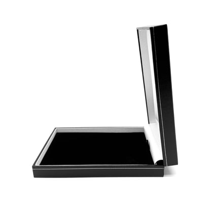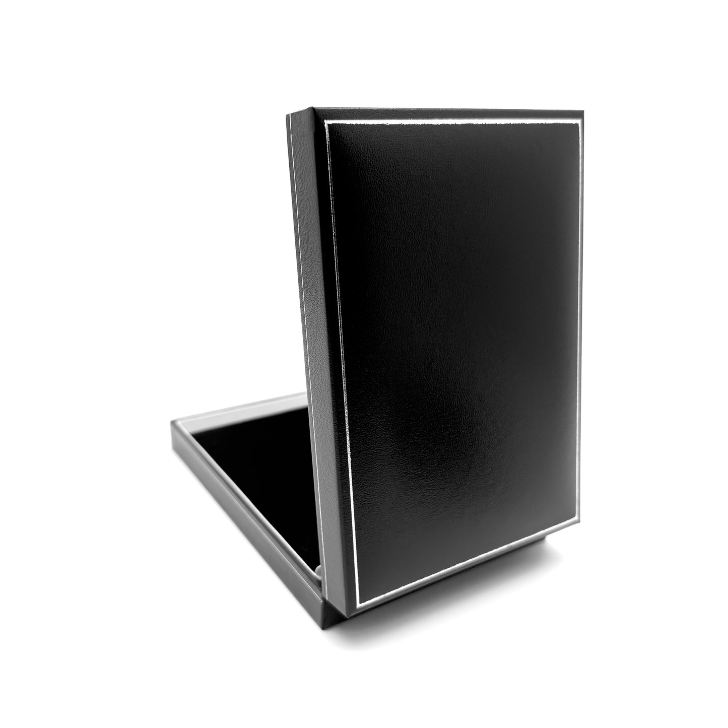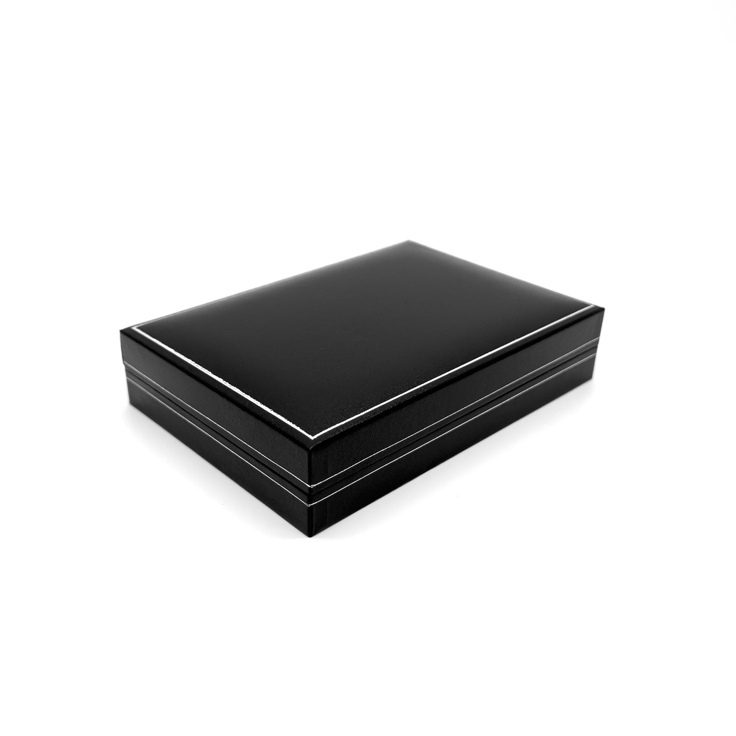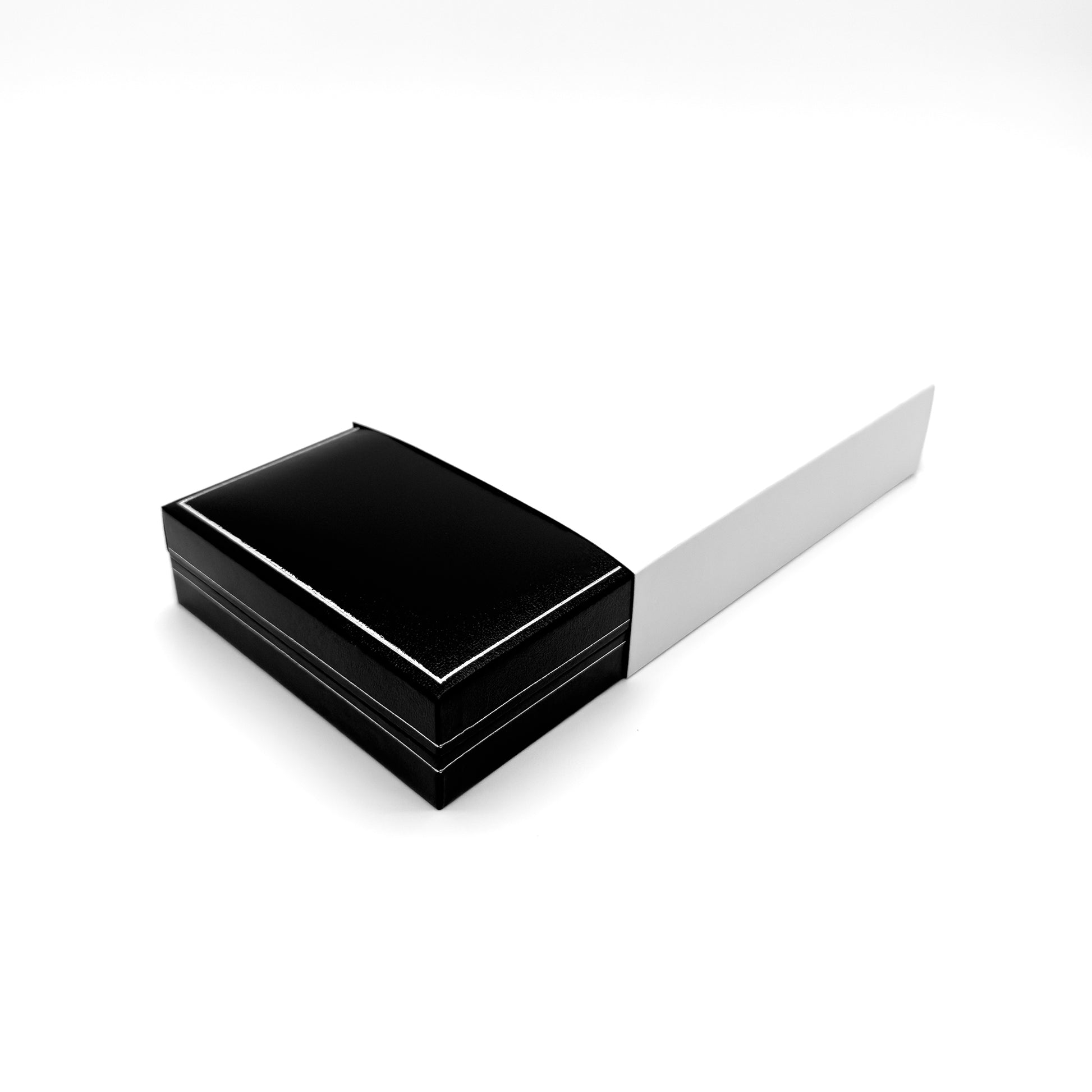 This spacious Portrait Necklace case, wrapped in black leatherette paper with silver profiling to the outside lid, is a timeless classic. Its hinge closure is seamless and satisfying, and the overall quality is quite remarkable. Each unit is supplied with a white, protective card sleeve.