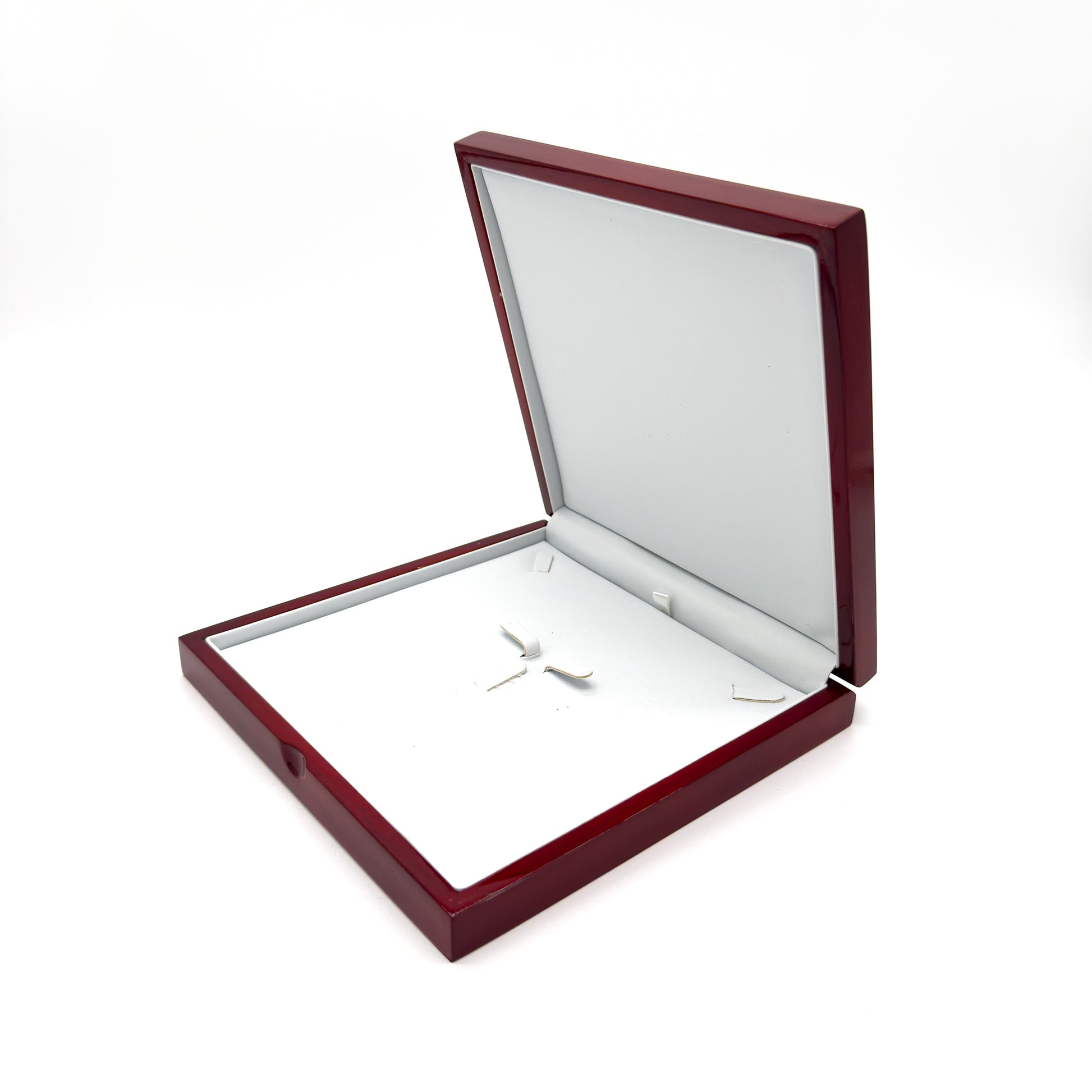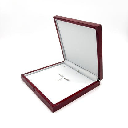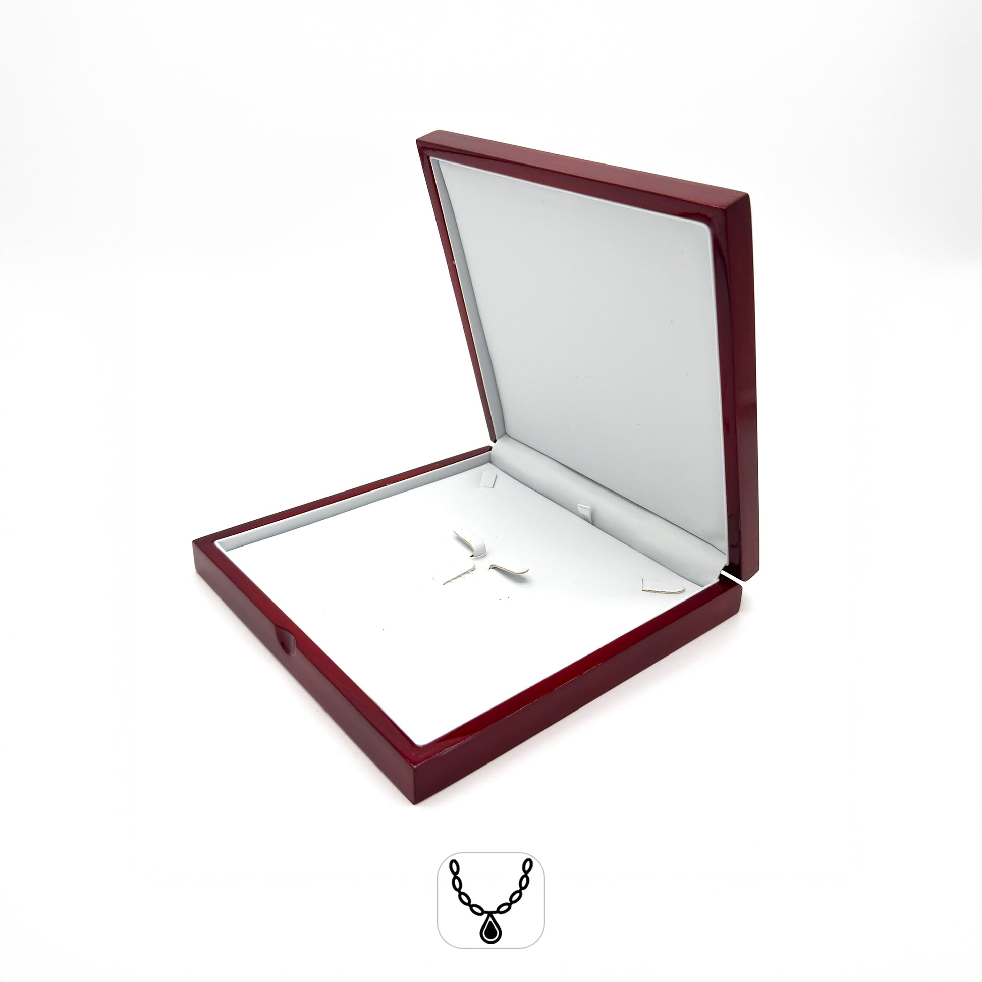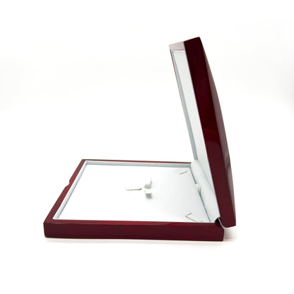 This luxury, hinged wood case is a great addition to your jewellery case setup. It houses necklaces and collars comfortably within its white PU leather base pad, and looks great on display.