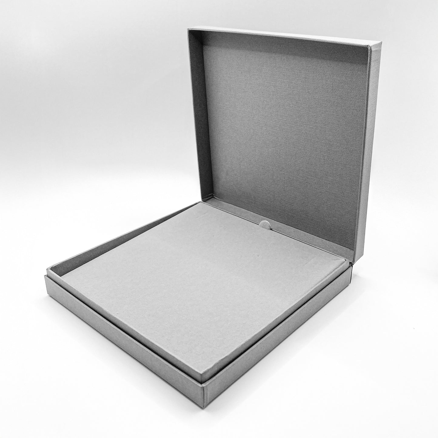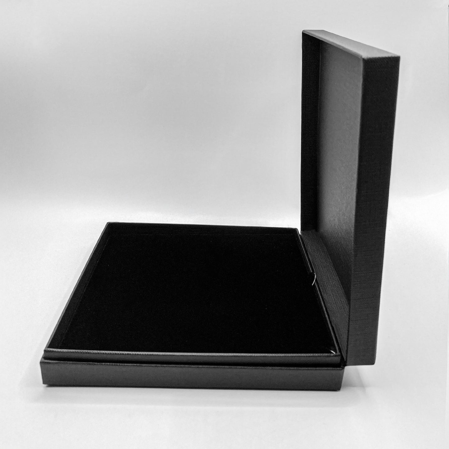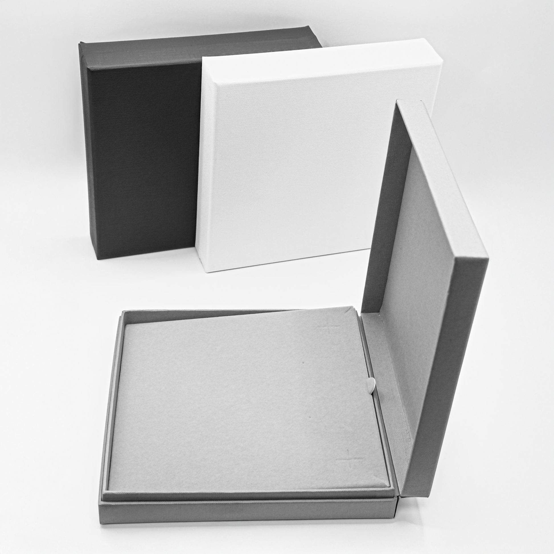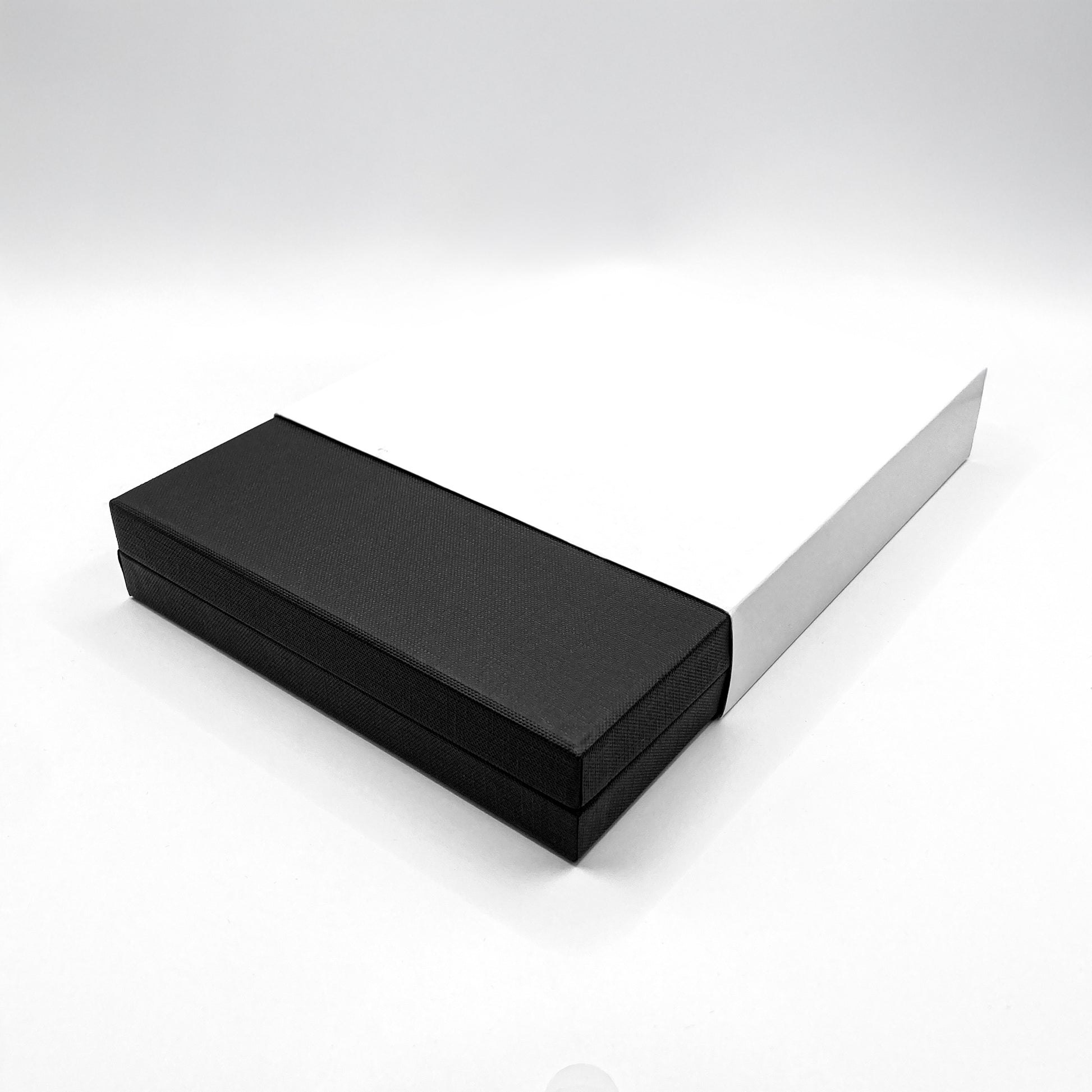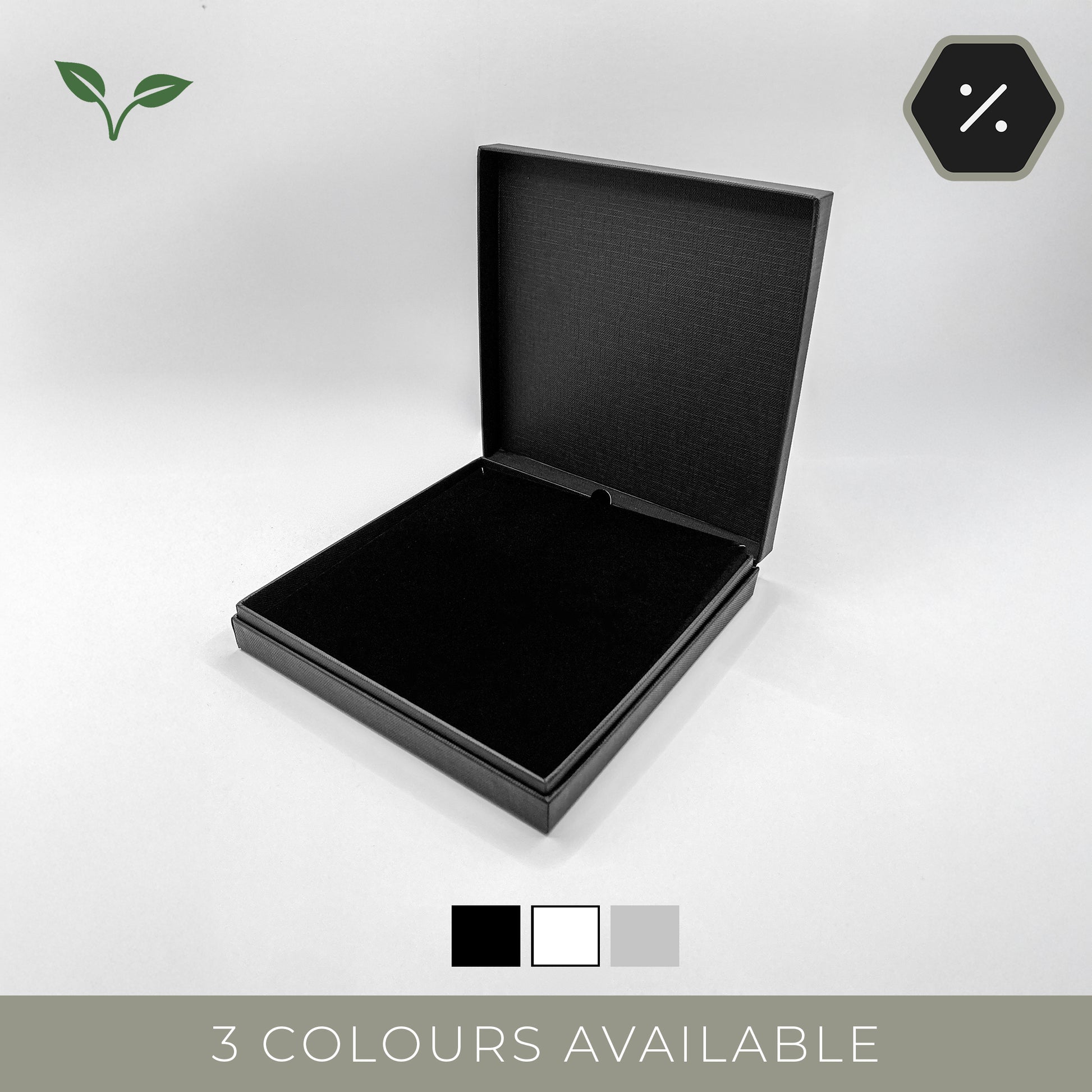 This simple hinged Necklace box is manufactured exclusively using FSC-accredited materials, including its faux suede card insert. Fully recyclable, this is the best option for the sustainability-minded customer. This eco-friendly box is available in black, white and grey. Each variant is supplied with a protective, white card sleeve.