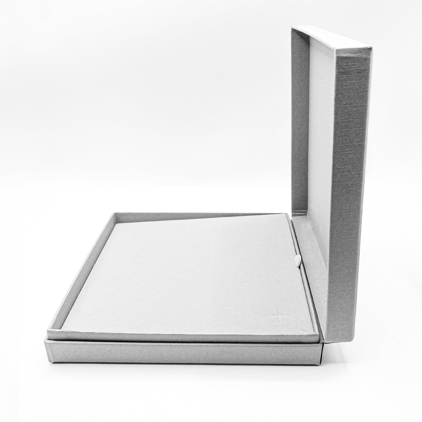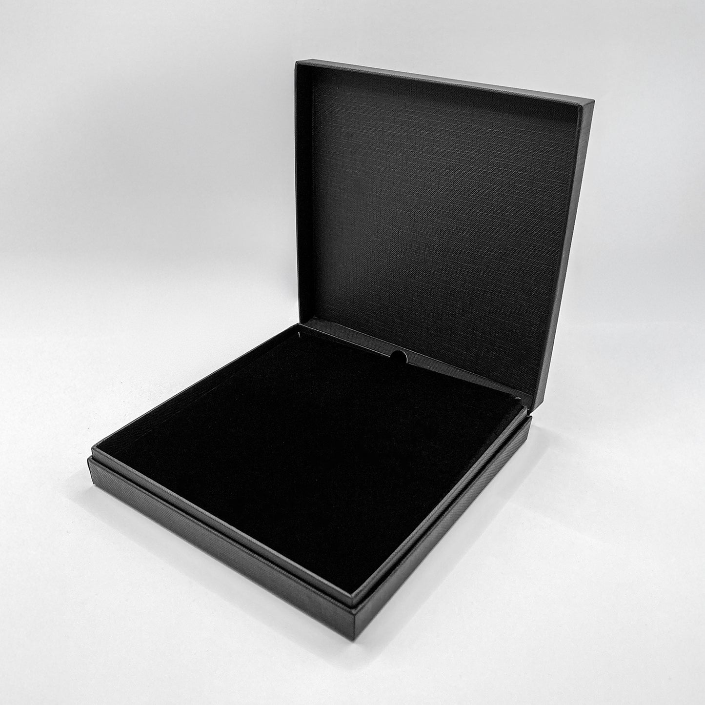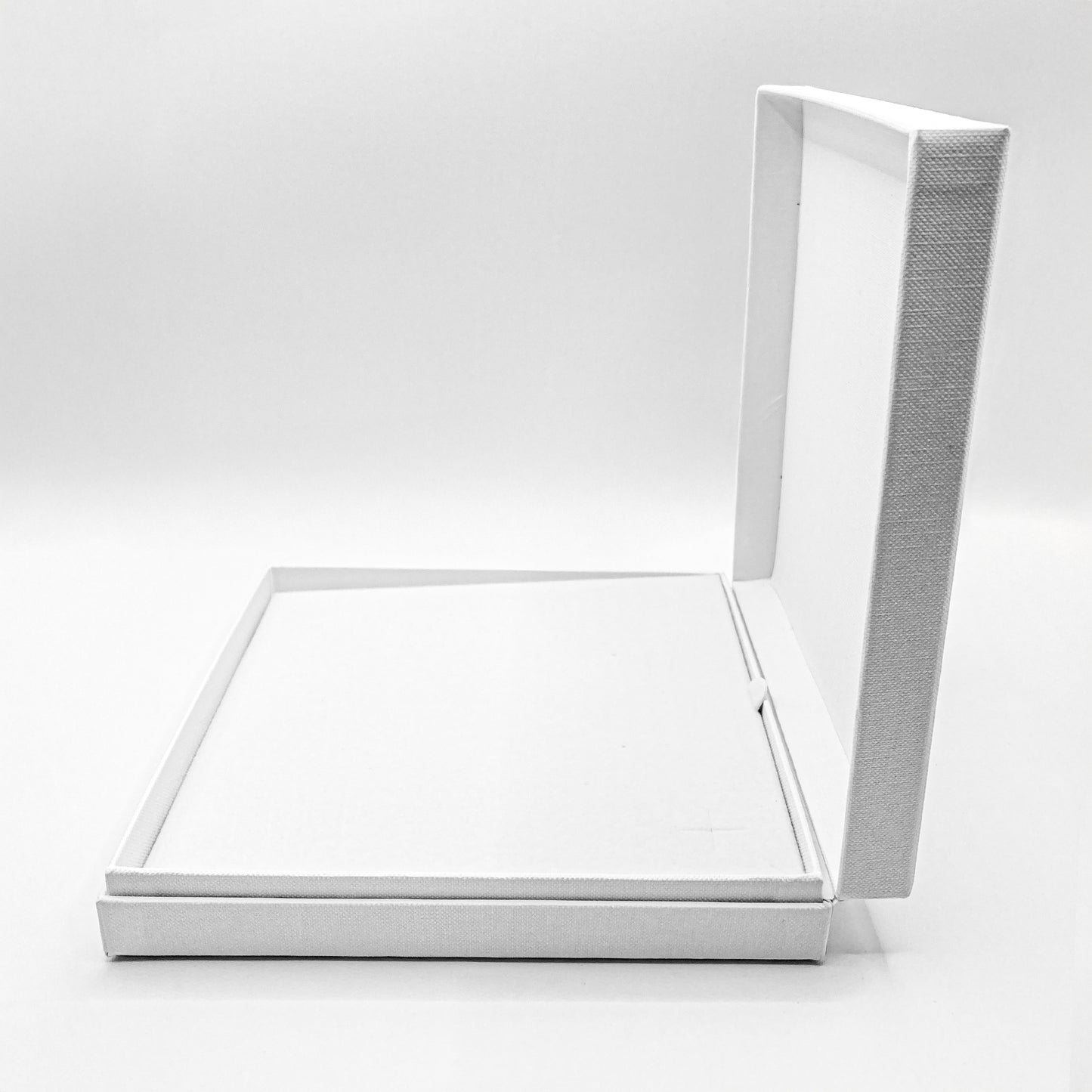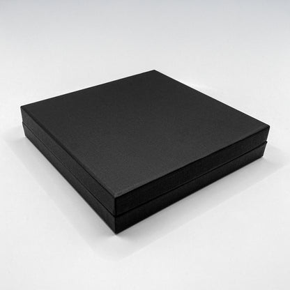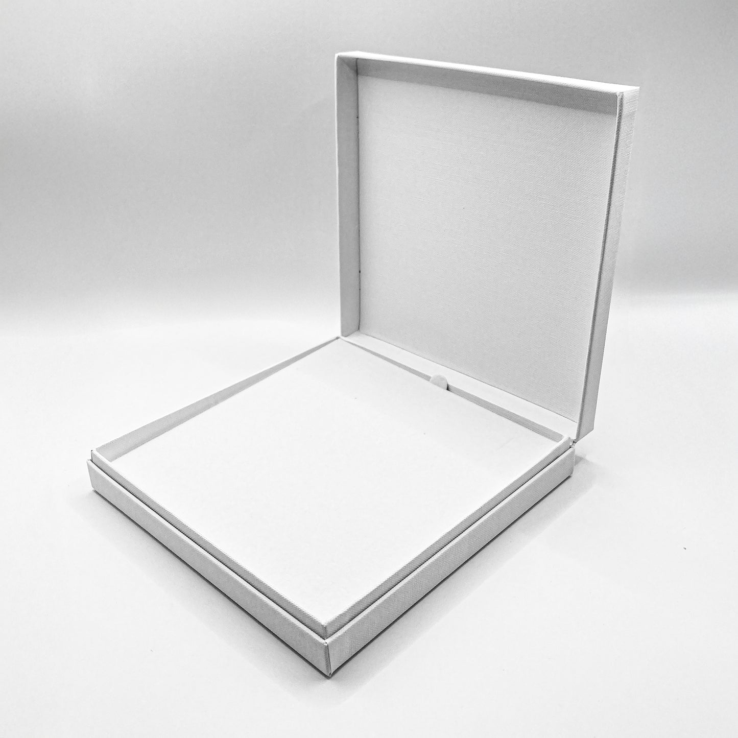 This simple hinged Necklace box is manufactured exclusively using FSC-accredited materials, including its faux suede card insert. Fully recyclable, this is the best option for the sustainability-minded customer. This eco-friendly box is available in black, white and grey. Each variant is supplied with a protective, white card sleeve.